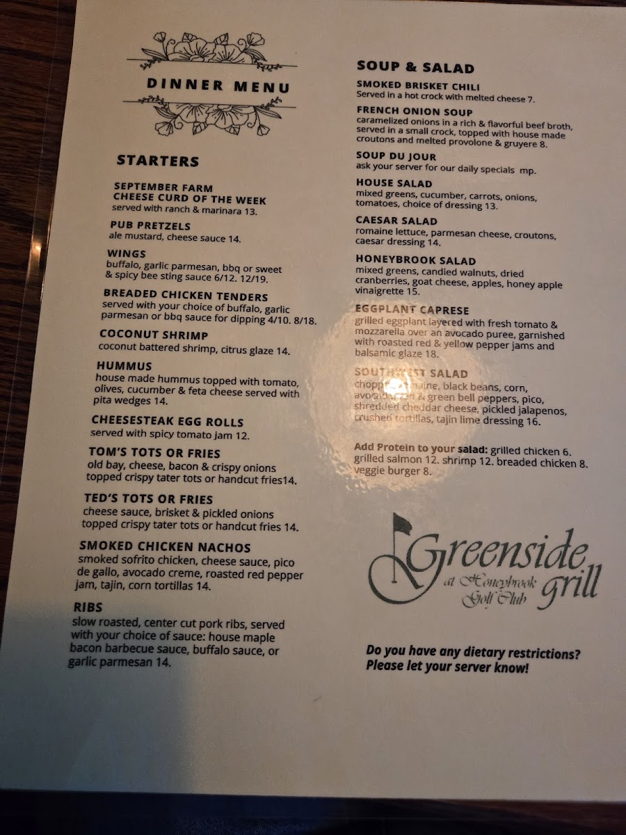 Looking for a spot to enjoy a delicious meal in Honey Brook? The Greenside Grill At Honeybrook Menu is a must-try. Nestled at 1422 Cambridge Rd, this cozy gem offers an inviting atmosphere with a wide range of flavorful dishes to satisfy all tastes. Whether you're in the mood for a hearty burger, a fresh salad, or something off their daily specials, there's something for everyone. The menu highlights locally sourced ingredients, ensuring a meal that's both delicious and satisfying. Whether you’re grabbing a quick bite or settling in for a relaxed meal with friends and family, you'll find just what you're craving. The casual vibe makes it an ideal place for any occasion, and with plenty of options to choose from, you'll keep coming back for more.